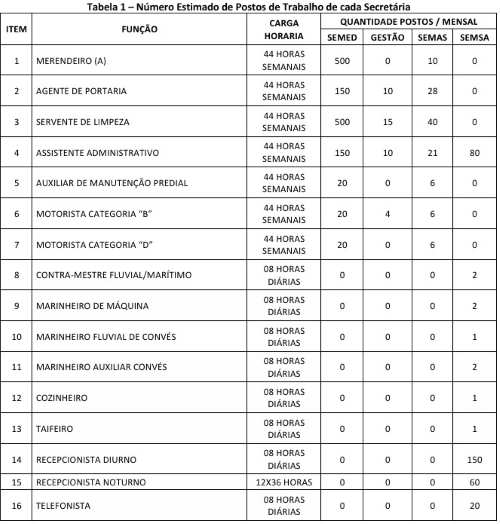 O edital de licitação também prevê a terceirização de 210 recepcionistas para unidades de saúde da Semsa. Na Semas (Assistência Social), serão contratadas merendeiras, agentes de portaria, serventes e auxiliares administrativos, totalizando 115 vagas.