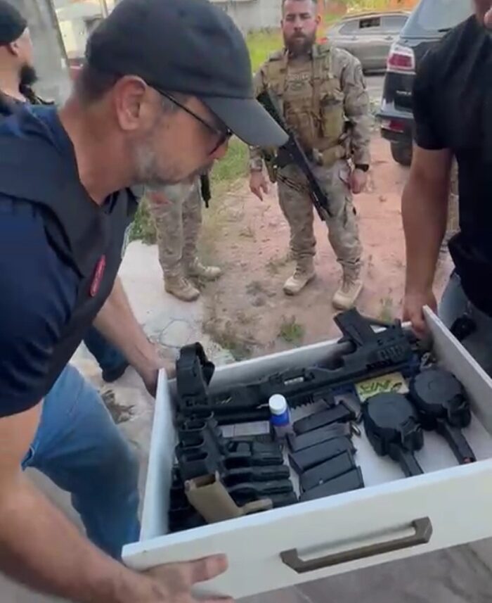 O miniarsenal era composto por: quatro pistolas glock 9mm, uma pistola .45, três carregadores estendidos de capacidade para 30 munições cada, dois carregadores tipo caracol com capacidade para 50 munições cada, além do adaptador que torna os armamentos automáticos.
