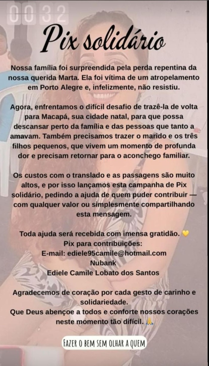 “Nossa família foi surpreendida pela perda repentina da nossa querida Marta. Agora, enfrentamos o difícil desafio de trazê-la de volta para Macapá, sua cidade natal, para que possa descansar perto da família e das pessoas que tanto a amavam. Também precisamos trazer o marido e os três filhos pequenos, que vivem um momento de profunda dor e precisam retornar para o aconchego familiar.”