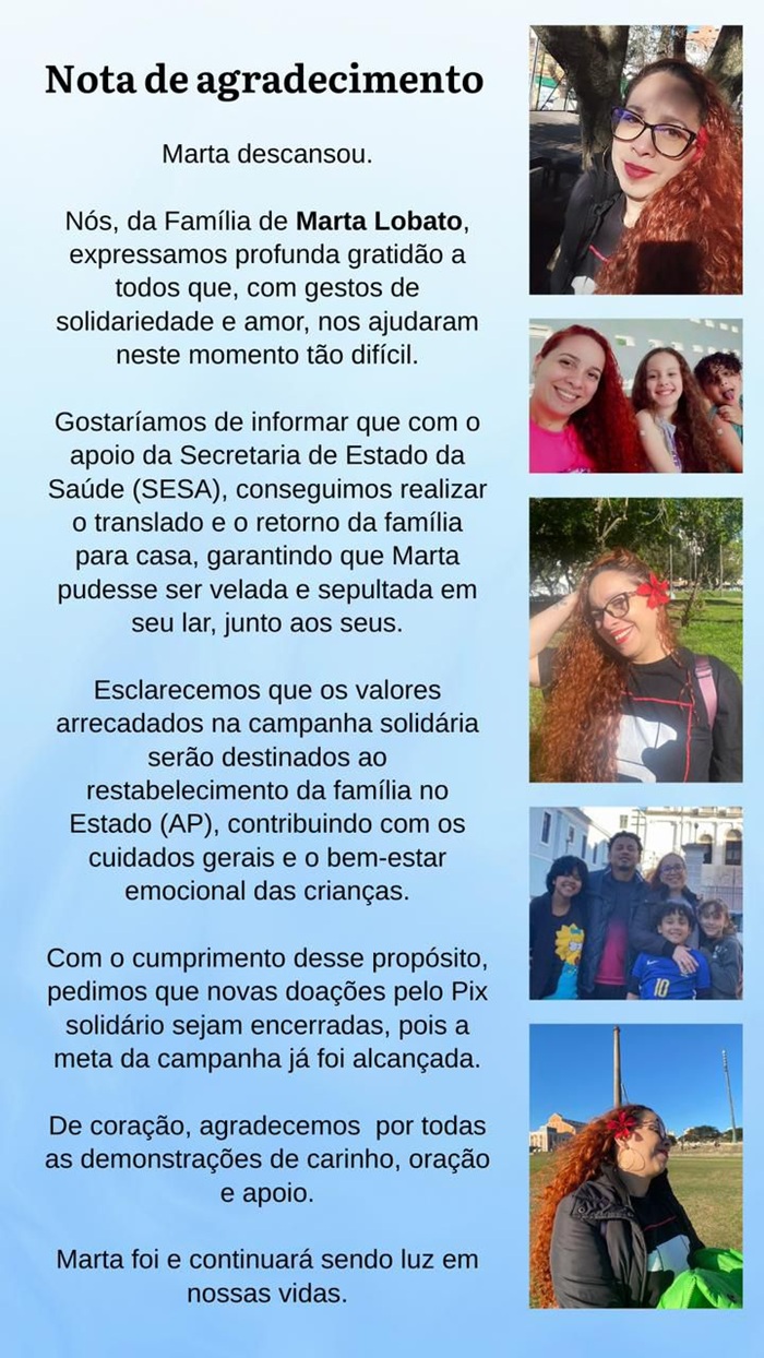 Família amapaense expressou publicamente sua gratidão pelo apoio recebido.