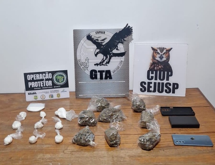 Um detento monitorado por tornozeleira eletrônica foi preso após jogar porções de maconha e cocaína pela janela de um apartamento do conjunto habitacional Macapaba. O caso ocorreu na manhã desta quinta-feira (23), após denúncia repassada aos policiais do Grupo Tático Aéreo (GTA).