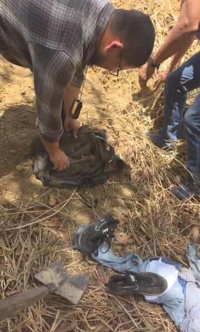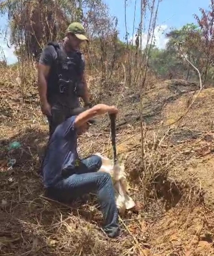Momento em que policial desenterra cartucheira usada no crime