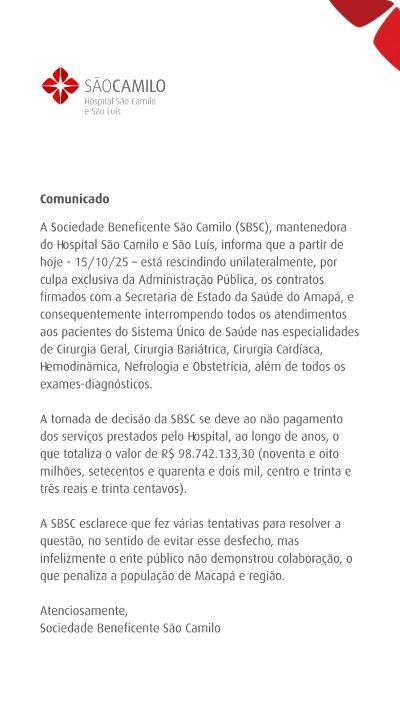 O Governo do Amapá anunciou, nesta quarta-feira (15), que adotará medidas administrativas e judiciais contra o São Camilo, o maior hospital privado do estado, após a instituição suspender todos os atendimentos de pacientes do Sistema Único de Saúde (SUS).