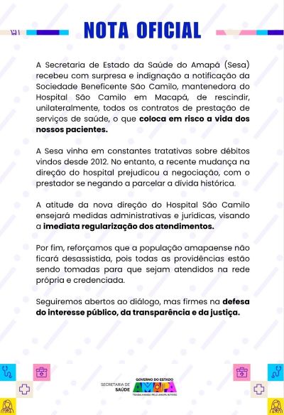 Em resposta, a Sesa afirmou que recebeu a notificação “com surpresa e indignação” e classificou a medida como uma atitude que “coloca em risco a vida dos pacientes do Amapá”. Segundo a secretaria, o governo vinha mantendo tratativas para resolver débitos antigos, que remontam a 2012, mas a nova direção do hospital teria se recusado a continuar as negociações e a parcelar a dívida.