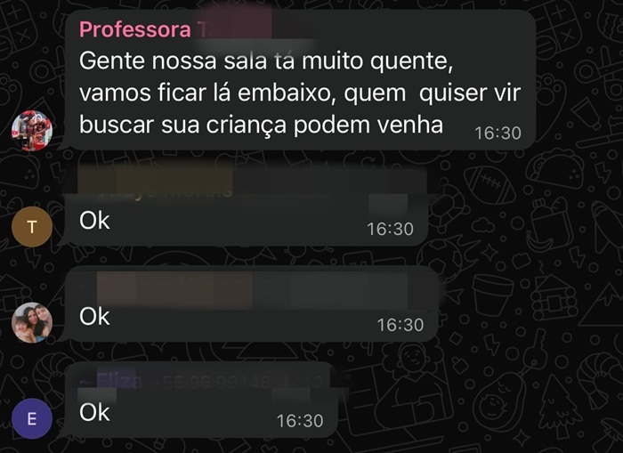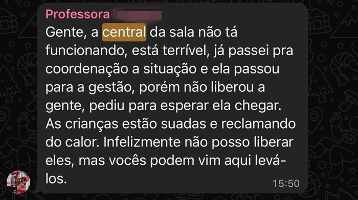 “A central da sala não está funcionando, está terrível. As crianças estão suadas e reclamando do calor. Infelizmente, não posso liberá-las, mas vocês podem vir buscá-las”, completou a professora, em mensagem que evidencia a insalubridade do ambiente e a falta de suporte do município.