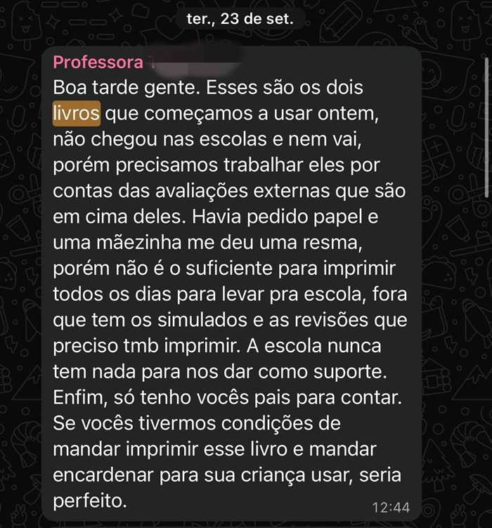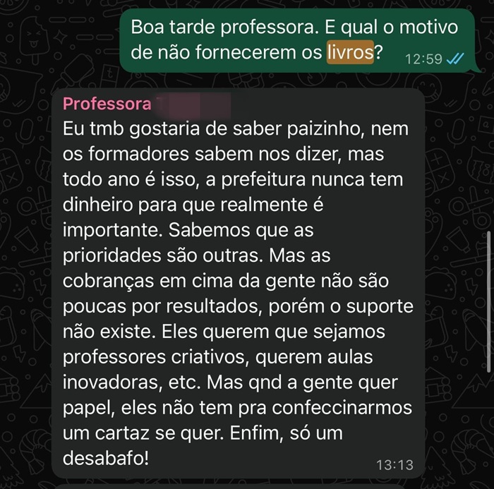 A situação se agrava com a ausência de livros didáticos. Segundo ela, os alunos estão usando apenas dois livros obtidos por conta própria, e os pais precisaram imprimir e encadernar o material por não haver fornecimento da escola.