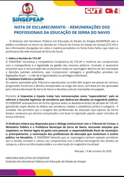 O Sindicato dos Servidores Públicos em Educação do Estado do Amapá (Sinsepeap) criticou o que chamou de ‘exposição’ a reportagem do Portal SN sobre a situação de professores da rede municipal de Serra do Navio, município localizado a 220 km de Macapá, após decisão do Tribunal de Contas do Estado (TCE-AP) que determinou o fim dos supersalários de 27 educadores. Alguns recebiam entre R$ 17 mil e R$ 20 mil.