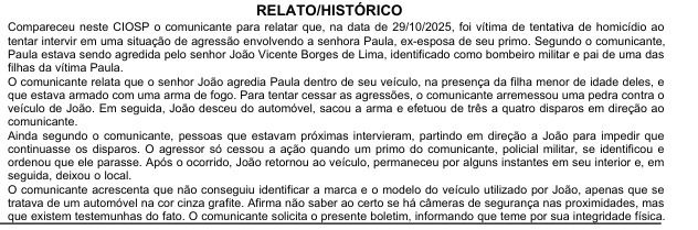 O episódio envolve o bombeiro João Vicente Borges Lima, que, durante uma briga com a ex-esposa no fim de outubro, teria disparado várias vezes contra Jederson Santos, primo dela. A vítima disse que tentou intervir jogando uma pedra contra o carro do militar, que reagiu com tiros. Nenhum disparo o atingiu, e ele registrou boletim de ocorrência por tentativa de homicídio, afirmando que os disparos só cessaram após a ordem de um policial militar.