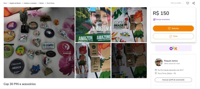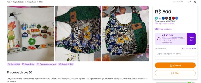 Durante a conferência — especialmente na Green Zone — filas extensas se formaram em busca de lembranças oficiais. Agora, esses mesmos produtos reaparecem nos sites como “souvenirs raros”. Os pins de países, os queridinhos do público, estão entre os anúncios mais frequentes, ao lado de brindes exclusivos da COP 30. A garrafinha temática, objeto de desejo entre os visitantes, é ofertada por até R$ 200. Itens usados por voluntários, como sapatos, bolsas e chapéus, também passaram a circular no mercado, custando entre R$ 200 e R$ 300.