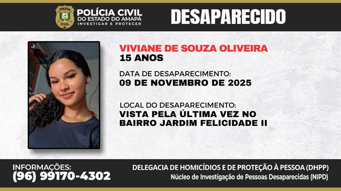 A Polícia Civil do Amapá, por meio da Delegacia de Homicídios e Proteção à Pessoa (DHPP), está empenhada nas buscas e faz um apelo urgente à população. Qualquer informação sobre o paradeiro de Viviane é essencial para aliviar o sofrimento dos pais e trazê-la de volta para casa em segurança.