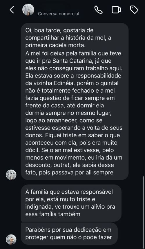Nas redes sociais, um morador informou que um dos cachorros era uma cadela batizada como Mel, abandonada pela família que se mudou para Santa Catarina atrás de trabalho.