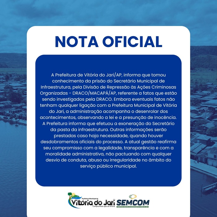 A Prefeitura de Vitória do Jari confirmou, por meio de nota oficial divulgada nesta terça-feira (18), a exoneração imediata do secretário municipal de Infraestrutura, José Diercirlei de Souza, após sua prisão pela Divisão de Repressão às Ações Criminosas Organizadas (Draco) de Macapá.