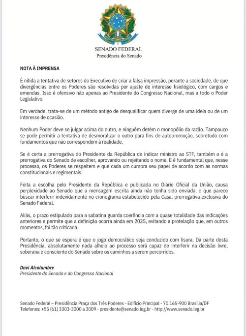 Para interlocutores no Senado, a nota de Alcolumbre é um recado claro de que a relação com o Executivo atingiu um nível de tensão pouco usual, e que o Legislativo não aceitará ser responsabilizado por eventuais atrasos ou derrotas do governo.