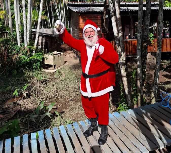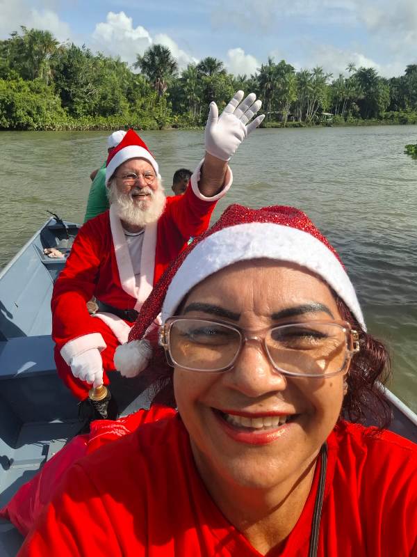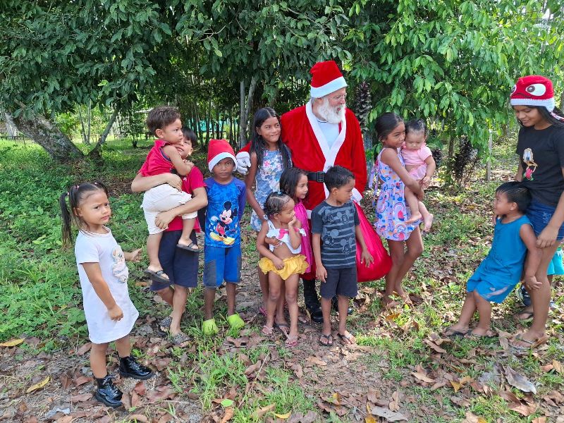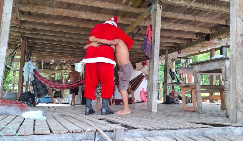 Este ano, a missão natalina teve como destino a comunidade do Abacate da Pedreira. A convite de Jean, um morador local, a ação aconteceu no último dia 14 de dezembro. O cenário não poderia ser mais amazônico e o Papai Noel desceu o rio de voadeira, parando de casa em casa.