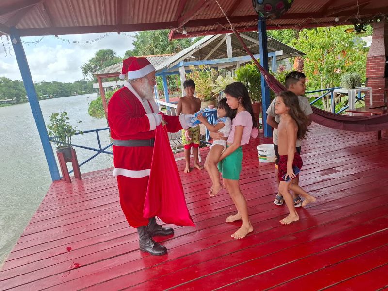 Este ano, a missão natalina teve como destino a comunidade do Abacate da Pedreira. A convite de Jean, um morador local, a ação aconteceu no último dia 14 de dezembro. O cenário não poderia ser mais amazônico e o Papai Noel desceu o rio de voadeira, parando de casa em casa.