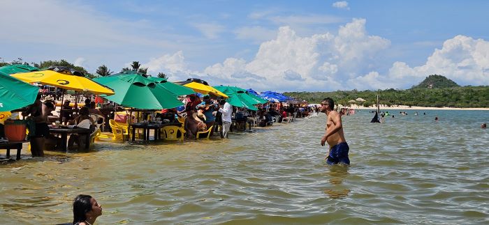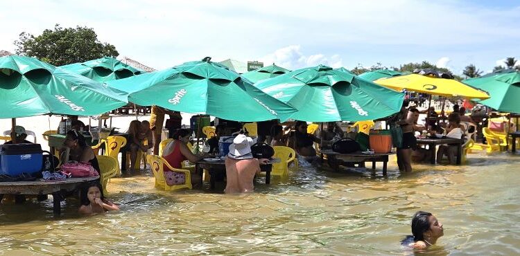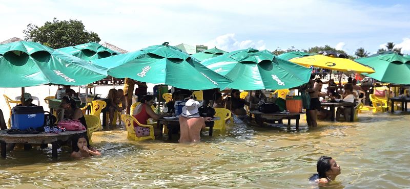 Uma caixa de som ligada em cada mesa na Praia do Amor, principal atração turística de Santarém (PA): uso descontrolado de aparelhos incomoda turistas