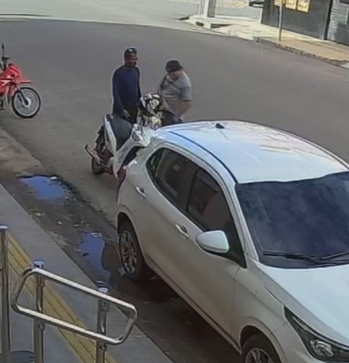 As imagens mostram dois homens chegando ao local em uma motocicleta. Sem demonstrar pressa e aparentando conhecer a rotina da área, um dos suspeitos — vestindo camisa escura — desce do veículo e passa a executar a ação criminosa.