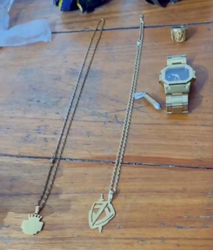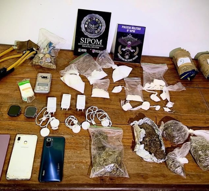 Durante a abordagem, foi constatado que, no interior da sacola, havia seis porções grandes e cinco porções pequenas de substância aparentando ser cocaína, além de cinco porções grandes de substância aparentando ser maconha. Sobre a mesa da sala, os policiais encontraram ainda os seguintes objetos: nove resistências elétricas; uma balança de precisão; dez embalagens de tabaco; dois cordões; um pingente; um relógio e um anel dourados; três fontes de carregador; quatro carregadores por indução; dois relógios digitais; R$ 95,00 em dinheiro — sendo R$ 4,00 em cédulas e R$ 91,00 em moedas —, além de dois estilingues do tipo baladeira.