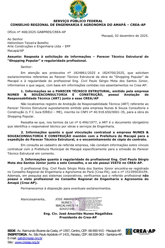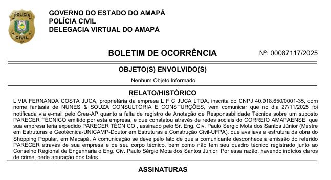 O processo é movido pelo comerciante Elieldo Almeida Marques, representante dos permissionários do shopping. Segundo a ação, o Conselho Regional de Engenharia e Agronomia (CREA-AP) apontou irregularidades graves nos laudos apresentados pela prefeitura — entre elas, a ausência do registro profissional do engenheiro que teria assinado o parecer.