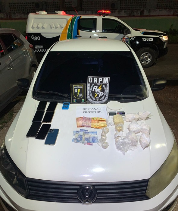 Com Renan Quaresma Oliveira, de 41 anos, a PM relatou ter encontrado duas porções médias de crack. Já com Samara Souza Dias, de 38, uma sacola contendo uma porção média da mesma substância. Durante a busca no interior do imóvel, os policiais localizaram, dentro de uma mochila infantil escondida no guarda-roupa do casal, várias porções grandes de crack. Ainda no local, foram apreendidos sete celulares, R$ 127 em dinheiro, uma máquina de cartão, um rádio comunicador e uma balança de precisão, materiais típicos do tráfico. No Gol branco indicado na denúncia, foi encontrada mais uma porção grande de crack escondida no compartimento de documentos.