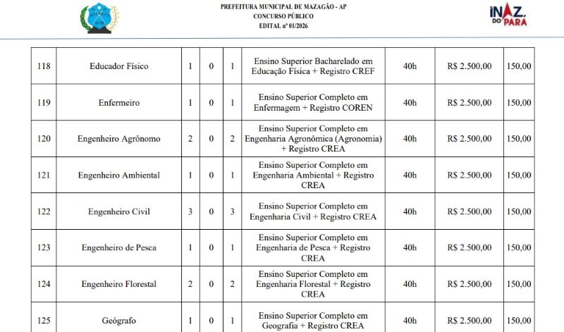 O concurso da prefeitura de Mazagão, município a 46 km de Macapá, recebeu um pedido de impugnação do Conselho Regional de Engenharia (CREA). O motivo é o salário oferecido para funções da engenheria (civil, pesca, agronomia) muito abaixo do piso nacional da categoria.