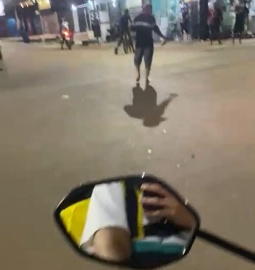 O vídeo, que circula em grupos de mensagens nesta terça-feira (27), mostra o momento em que o motociclista avista a confusão nas proximidades de um mercantil. Em vez de acionar as autoridades ou buscar abrigo, o entregador decide “fazer a cobertura” do evento.