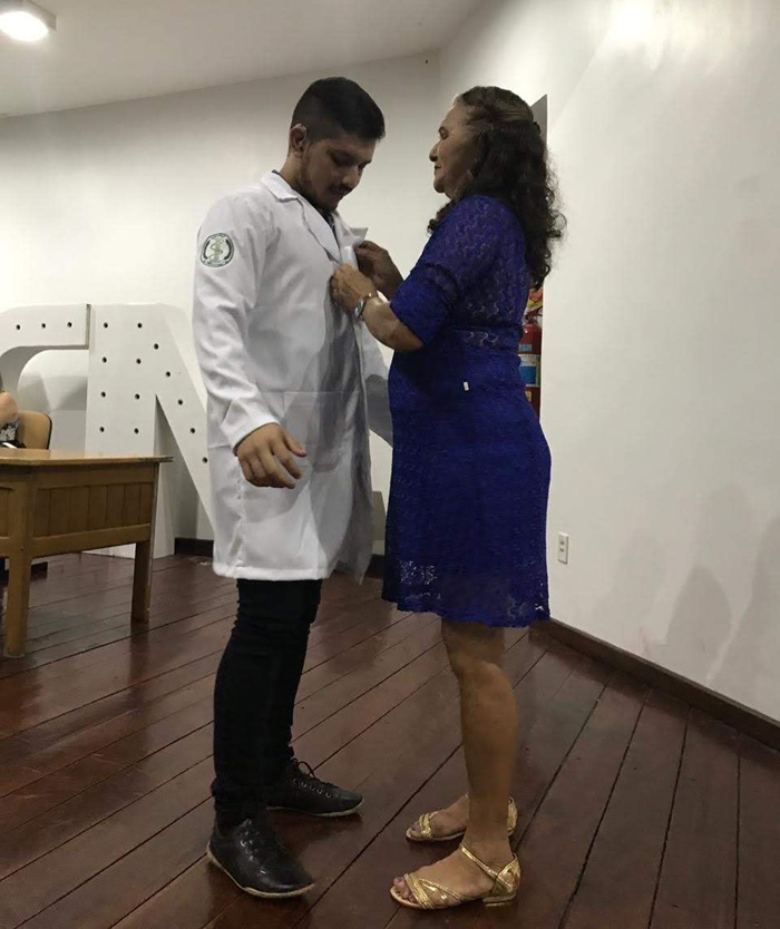 1º dia do curso, com a mãe vestindo Reginaldo com o jaleco: gesto simbólico do que viria pela frente. Fotos: Arquivo Pessoal