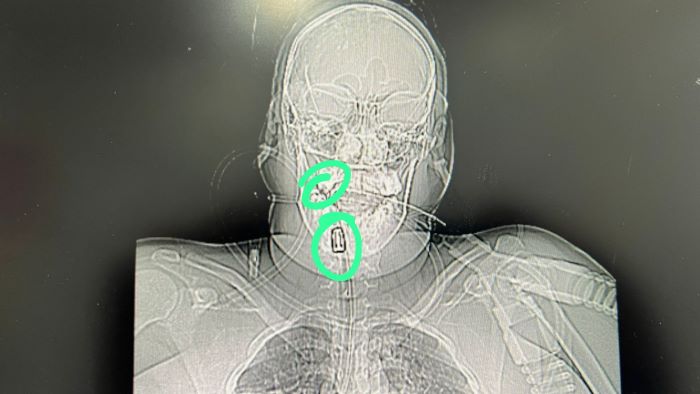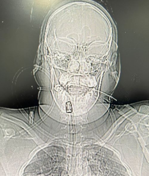 A gravidade do caso foi confirmada por exames de imagem. Embora não houvesse sangramento externo abundante inicial, os médicos localizaram um orifício de entrada centralizado na cabeça.