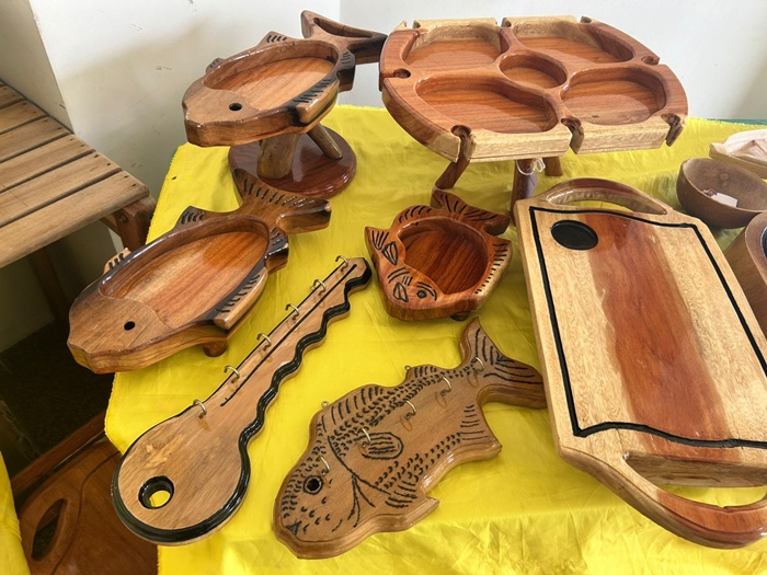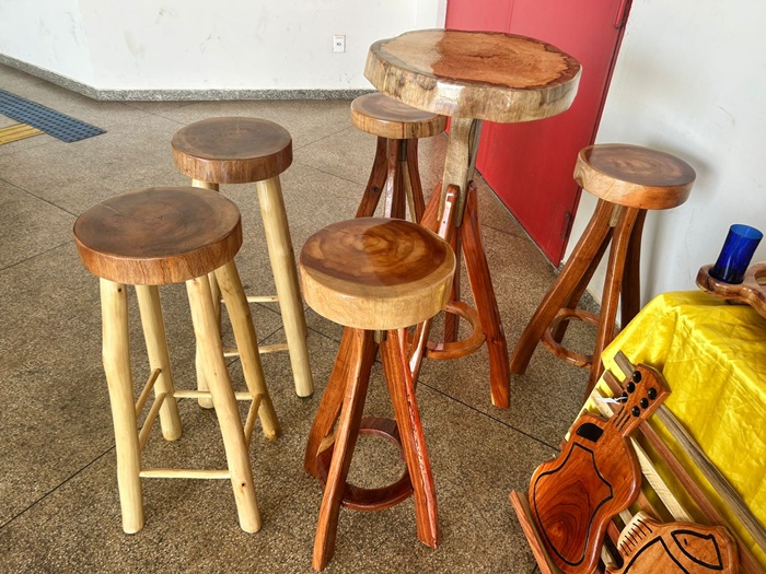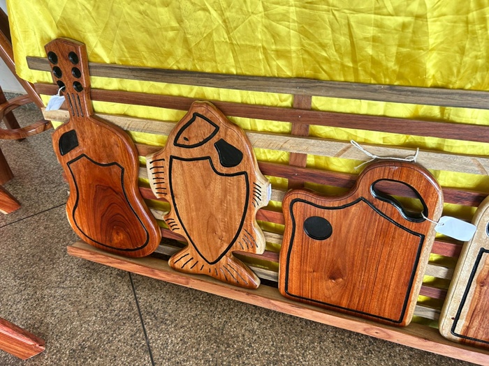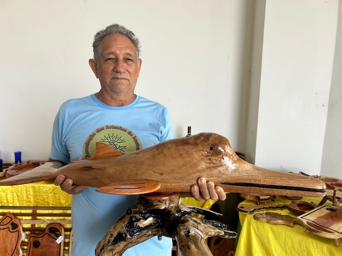 Na sua casa, praticamente tudo pode ser produzido. Petisqueiras, tábuas de corte, porta-chaves e esculturas de animais, como o delicado boto, revelam a versatilidade do artesão. Entre as criações mais valorizadas está um jogo de mesa, que pode chegar a R$ 1 mil, enquanto petisqueiras variam entre R$ 250 e R$ 280.