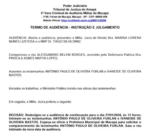 Em audiência realizada no dia 5 de novembro, na 3ª Vara Criminal de Macapá, duas testemunhas importantes não compareceram: a esposa de Alessandro Belém e o prefeito Antônio Furlan. Por isso, a juíza Marina Lustosa marcou nova audiência para o próximo dia 27.