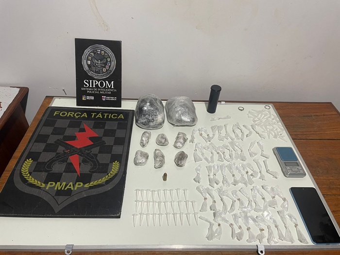 Na abordagem, os militares encontraram maconha. Já na mochila abandonada durante a fuga havia um verdadeiro kit do tráfico: crack, cocaína, mais maconha, balança de precisão e ainda uma munição intacta de calibre 40.