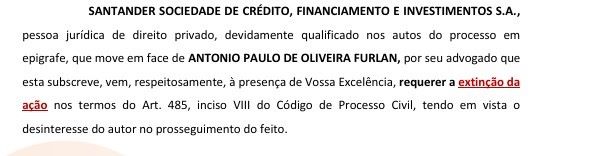 Nos autos do processo de número 6104709-49.2025.8.03.0001, a financeira Aymoré Crédito (Santander) requereu a extinção da ação com base no artigo 485, inciso VIII, do Código de Processo Civil, alegando “desinteresse no prosseguimento do feito”.