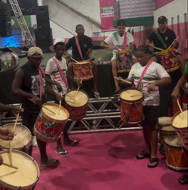 Na publicação, o mestre Rodrigo Explosão, que comanda a bateria da verde e rosa ao lado de Taranta Neto, mostrou um naipe de ritmistas tocando as tradicionais caixas de Marabaixo. Segundo o mestre, o instrumento será utilizado durante o alusivo — momento que precede o canto do samba-enredo oficial, funcionando como uma introdução solene e ritualística.
