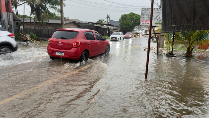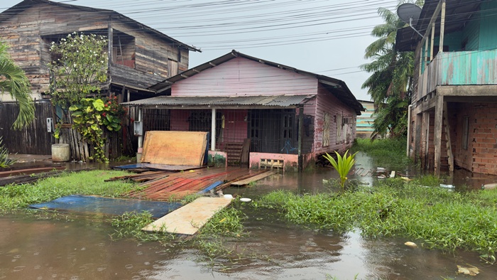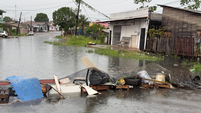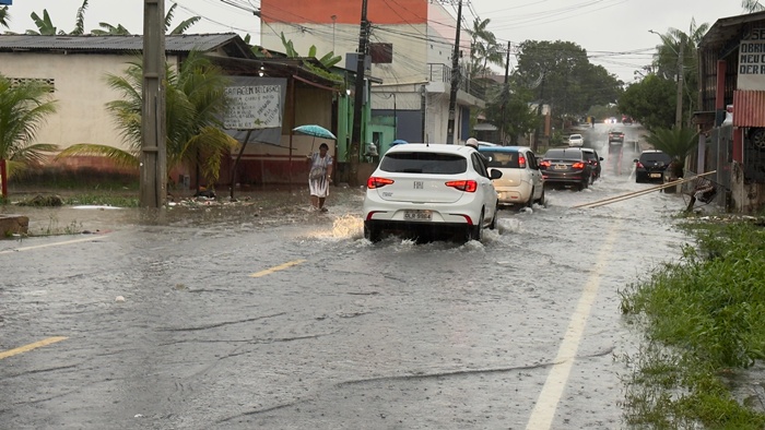 As fortes chuvas que atingem Macapá desde a tarde de segunda-feira (9) deixaram um rastro de destruição e transtornos na capital amapaense. Na manhã desta terça-feira (10), o cenário em diversos bairros era de isolamento: ruas transformadas em canais transbordados, lixo espalhado pelas vias e moradores tentando proteger suas casas e sinalizar os perigos para quem trafega.