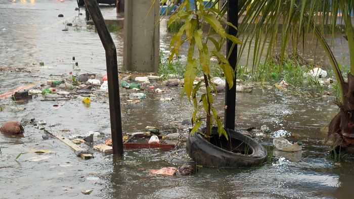 A situação é ainda mais grave na Avenida Pedro de Oliveira Gomes (Nova Esperança). Onde deveria haver um canal de escoamento, formou-se um “rio de lixo”. O entupimento fez com que a água invadisse residências e comércios. Mesmo com a força da correnteza e a sujeira, muitos pedestres e ciclistas ainda se arriscavam na travessia na manhã de hoje.