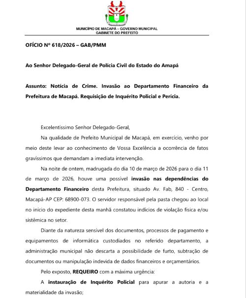 A Polícia Civil do Amapá abriu inquérito para investigar uma denúncia de furto de HDs, sabotagem ao sistema do Diário Oficial e invasão do setor financeiro da Prefeitura de Macapá. O registro foi feito pelo prefeito em exercício, Pedro Dalua (União), por meio de ofícios enviados à Delegacia-Geral de Polícia.
