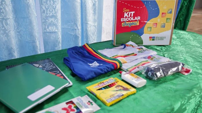 Os kits distribuídos são compostos por cadernos, lápis de cor, giz de cera, cola, lápis, borracha, estojo e uniforme com duas camisas e uma calça de moletom.
