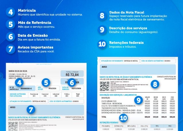 A Concessionária de Saneamento do Amapá (CSA) passa a adotar, a partir de 2 de março de 2026, um novo modelo de fatura de água em todo o Amapá. A mudança faz parte de um acordo com o Governo Federal e integra a padronização nacional das informações fiscais do setor de saneamento, com foco em mais clareza, organização e transparência para os consumidores.
