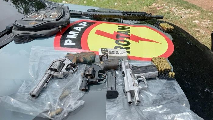 Após o confronto, os policiais realizaram buscas na residência e apreenderam um verdadeiro arsenal, composto por dois revólveres, uma pistola e uma arma longa, que será submetida à perícia para verificação de funcionamento.
