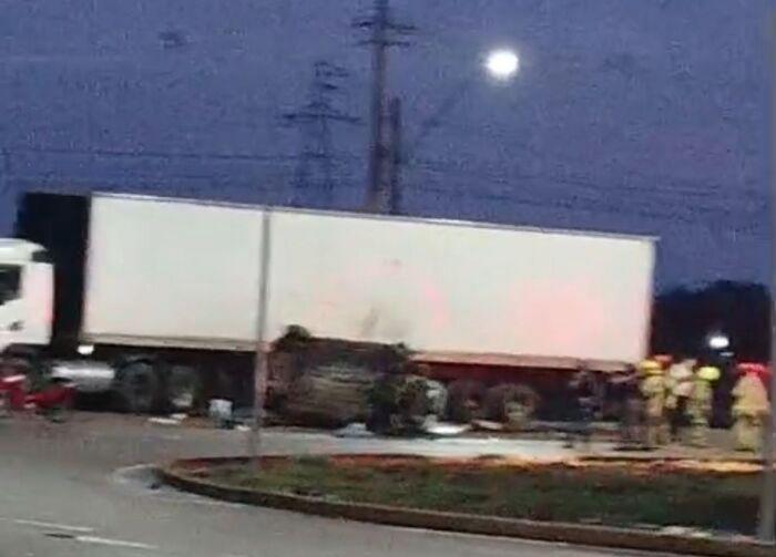 Mulher morre após carro capotar e colidir com caminhão na rotatória do Trevão