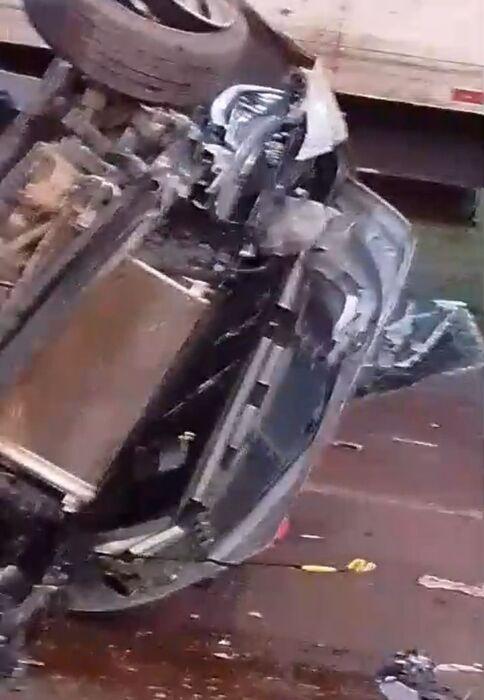 Caminhão estava parado no acostamento quando foi atingido pelo carro desgovernado; dinâmica do acidente e possíveis fatores ainda são apurados