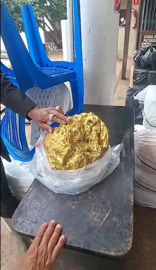 No vídeo, o homem coloca sobre uma mesa uma grande pedra dourada, dentro de um saco plástico, enquanto é cercado por moradores. Quem grava é um frentista empolgado que brinca com a situação, incentivando a reação dos presentes que registram a cena com celulares. Em meio às risadas, um dos espectadores chega a dizer que o “ouro” poderia bancar campanhas políticas neste ano.