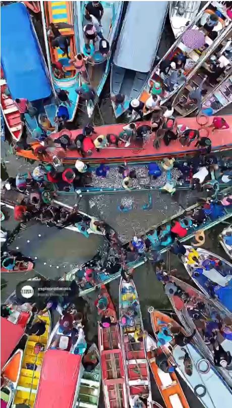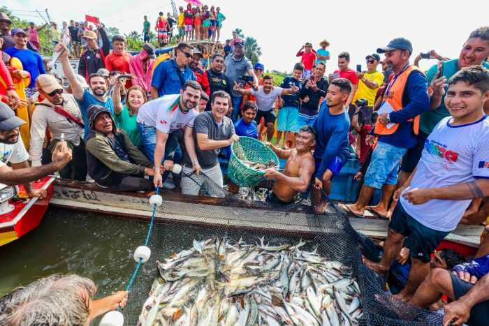 O ponto alto da programação foi o tradicional “borqueio”, técnica coletiva em que as embarcações se posicionam em círculo para cercar o cardume de mapará. A estratégia exige coordenação e trabalho em equipe. Após a identificação do ponto onde o peixe se concentra, os barcos fecham o cerco, as redes são lançadas e a puxada é feita de forma conjunta, reunindo força, técnica e experiência dos pescadores.