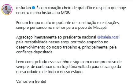 O prefeito de Macapá, Antônio Furlan, não é mais do MDB, partido comandado no Amapá pelo deputado federal Acácio Favacho. Ontem (2) ele formalizou sua desfiliação da legenda e hoje anunciou que está no PSD, do senador Lucas Barreto.