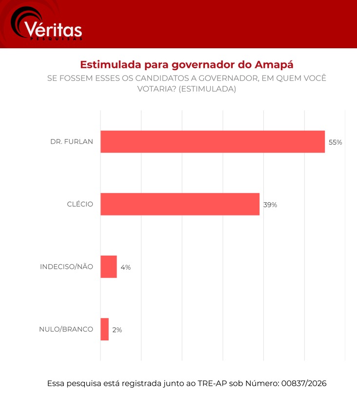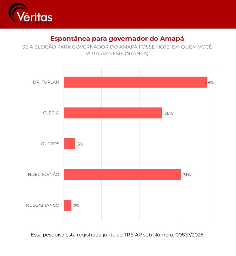 A pesquisa da Véritas foi realizada entre os dias 17 e 19 de março de 2026, com 800 entrevistados, margem de erro de 3% e nível de confiança de 95%, estando registrada no Tribunal Regional Eleitoral do Amapá sob o número 00837/2026.