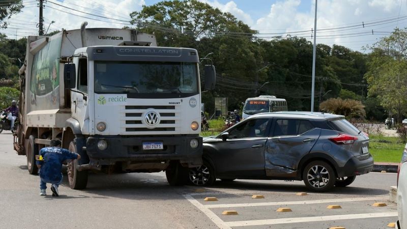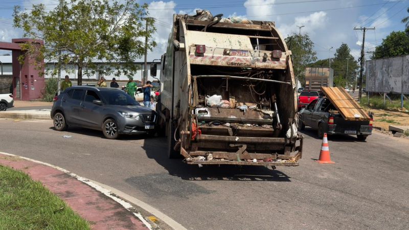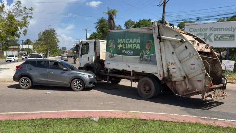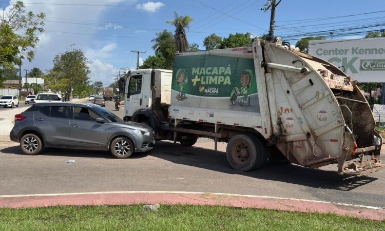 Um acidente envolvendo um caminhão de coleta de lixo da Prefeitura de Macapá e um carro de passeio causou transtornos no trânsito da Zona Sul da capital na tarde desta terça-feira (28). A colisão ocorreu na rotatória da Embrapa, um dos pontos mais movimentados da cidade. De acordo com informações apuradas no local, os dois veículos seguiam pela Rua Inspetor Marcelino, no sentido bairro Universidade, quando se aproximaram da rotatória. O caminhão teria sinalizado uma conversão à direita para acessar a Rodovia Josmar Chaves Pinto (JP), onde realizaria a coleta de resíduos.