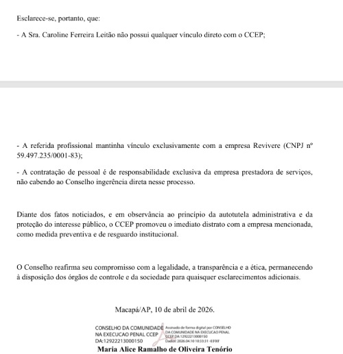 O Conselho da Comunidade na Execução Penal da Comarca de Macapá (CCEP) se manifestou oficialmente nesta sexta-feira (10) após a prisão de Caroline Ferreira Leitão, motorista terceirizada flagrada com drogas e celulares que seriam destinados a presos no Instituto de Administração Penitenciária do Amapá (Iapen). Em nota, o Conselho esclareceu que a investigada não possui qualquer vínculo direto com a entidade. Segundo o posicionamento, Caroline era funcionária da empresa Revivere, contratada para prestação de serviços acessórios no âmbito de parceria firmada com o sistema penitenciário.