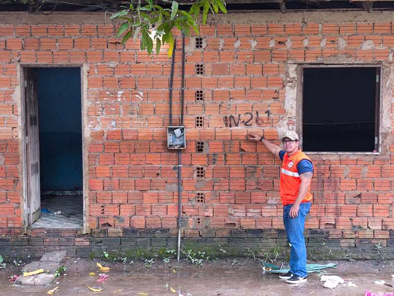 Coordenador mostra onde a água chegou em algumas residências. Fotos: Defesa Civil